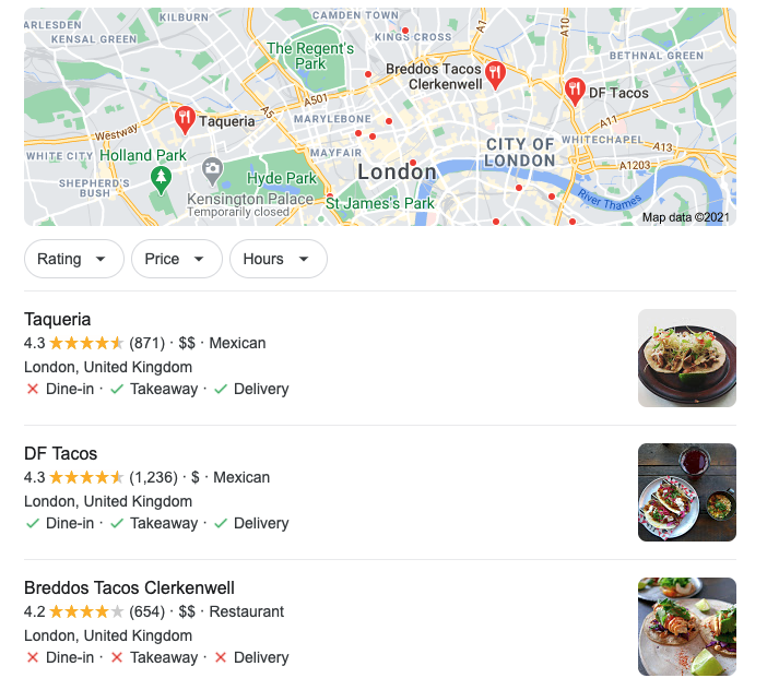 Discovery searches are when customers are interested in a product category or specific item that Google thinks you are likely to sell. For example, if you sell tacos you may get a lot of traffic coming from people looking for “tacos near me”. To maximise your chances of being displayed for discovery searches, make sure you list all your products and services in your GMB profile – include your whole menu and make sure you include information about your cuisine and other distinctive features (e.g. making sure “vegan Mexican tacos” appears within your profile).