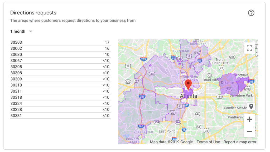 This is a very cool feature. When users ask Google (using Google Maps) for directions to your business from their current location, Google saves this information. Obviously, it won’t divulge their exact address, but it will give you an indication of the general area (postcode or city) where they are located when requesting directions to your business. This sort of information can provide useful insights into how effective your marketing is in certain neighbourhoods, and where you could promote more.