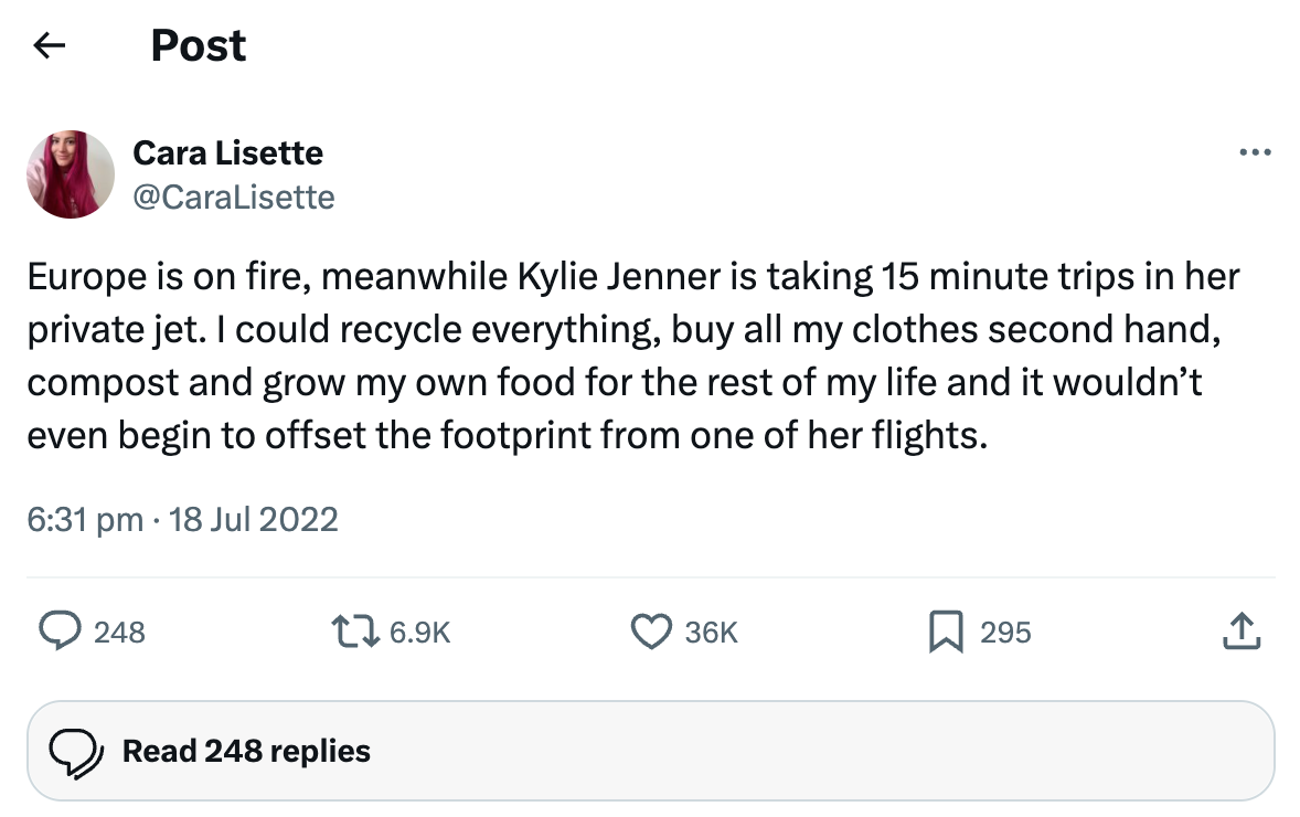 It is a valid reaction to be frustrated by the fact that those who are (and will continue to be) the least impacted by the climate crisis are the same people making the situation worse for everyone else, while the majority of us bend over backwards to make even the slightest improvements to our footprint.