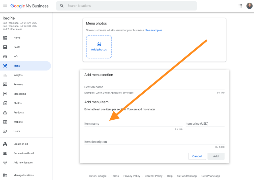 Adding your menu into GMB itself allows Google to properly label your items, splitting them by ‘Menu Section’, ‘Menu Item’ and ‘Price’. This is an easier way to label these items for Google instead of manually adding them to your own website’s HTML (which wouldn’t hurt to do as well, if you have the technical skills).
