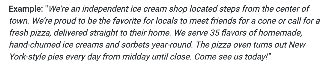 This is where your creativity and writing skills come in handy (and if that’s not your forte, Google also provides guidance and a few handy tips on writing your business description).