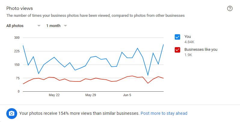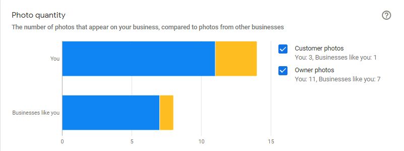 In your GMB analytics area, Google provides you with some interesting insights by comparing images you’ve uploaded to those added by customers. It also gives you some performance metrics on how many times your photos have been viewed and compares your stats to other businesses Google thinks are similar to yours.